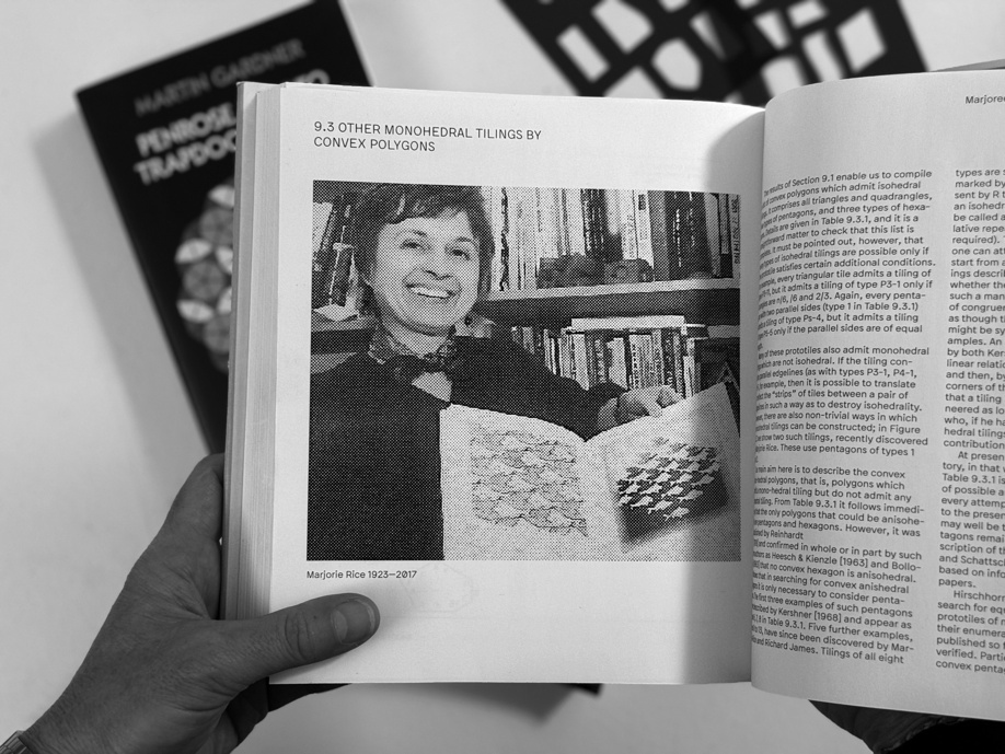 Living in San Diego, Marjorie Rice was at the time a fifty two year old home maker and a mother of five children. She worked in secret at her kitchen table on the tessellation problem — none of her family was aware. Without any background in mathematics, she devised a new symbolic notation system to classify the known tilings and started her search for new ones. Within a few months, in February 1976, she shared a new tiling (type 9) with Martin Gardner: