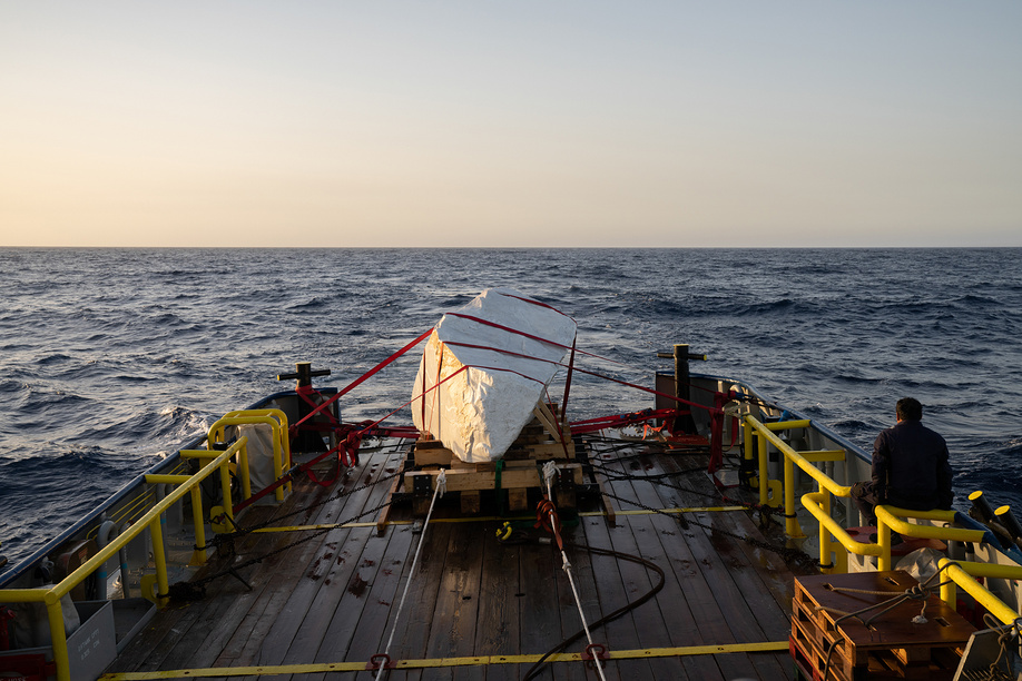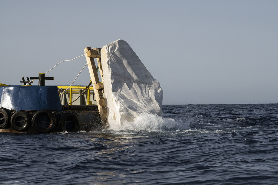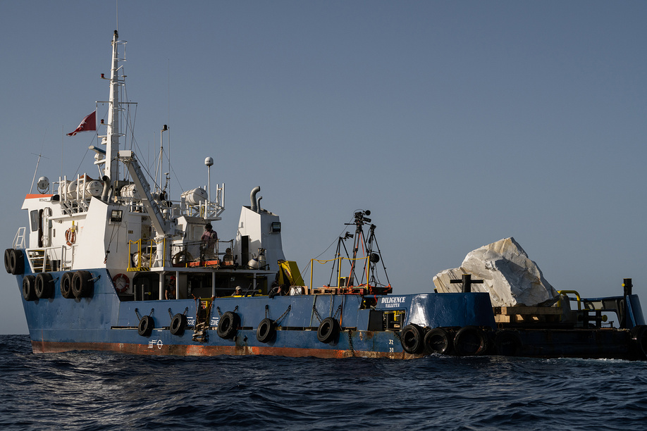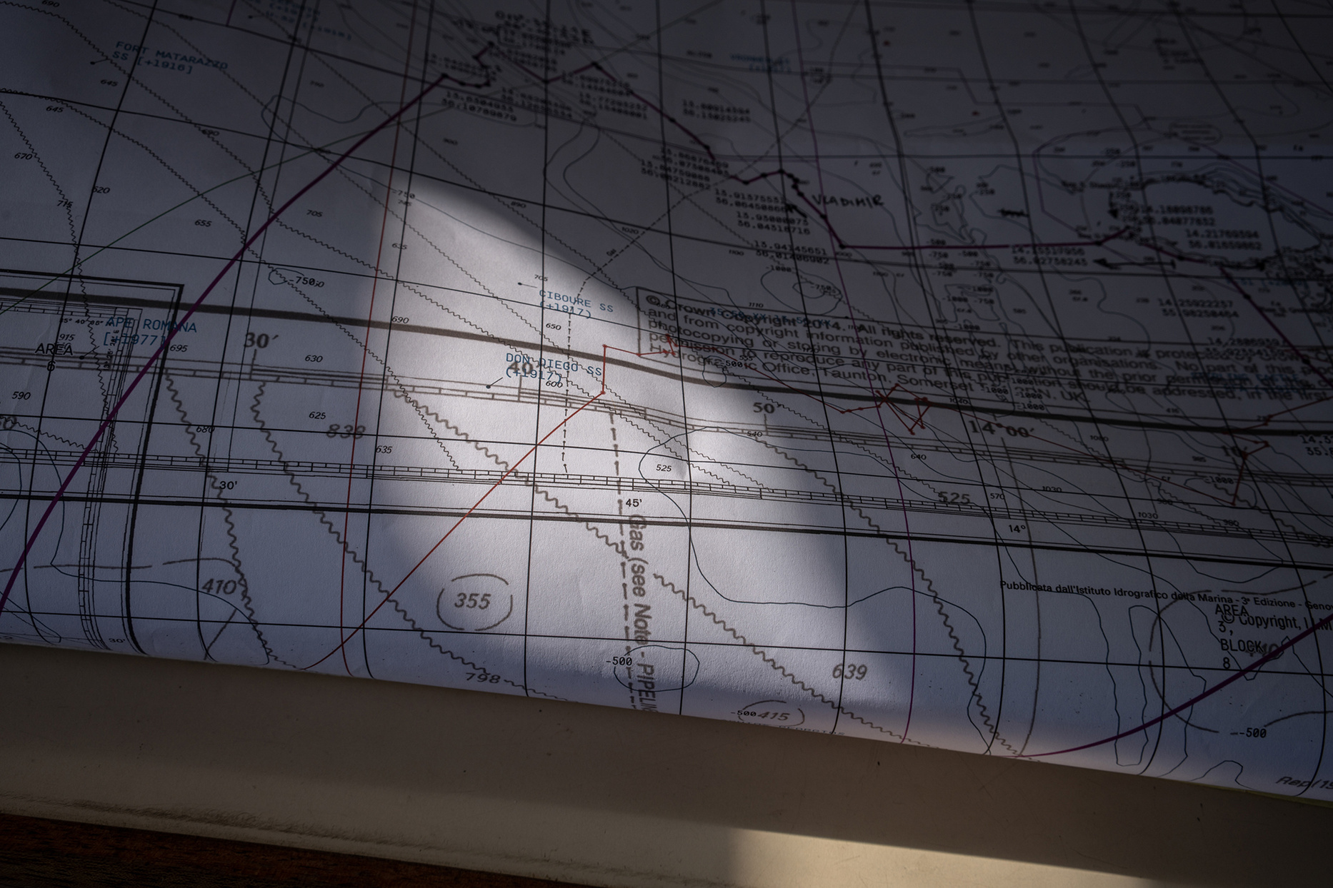 May 2021 – Cartography for a performance by artist Rossella Biscotti that has taken place in the Mediterranean Sea between 20 and 23 May 2021. The Journey is a performance of a ship navigating a GPS content-related route inspired by time, history and current geopolitical data researched together with different experts and communities in an area of the Mediterranean Sea between Italy, Malta, Tunisia, Libya. The narrative is centered on the decision and consequences of dropping a 17-ton marble block awarded to the artist by the iconic Michelangelo quarry in Carrara, Italy, yet left untouched.