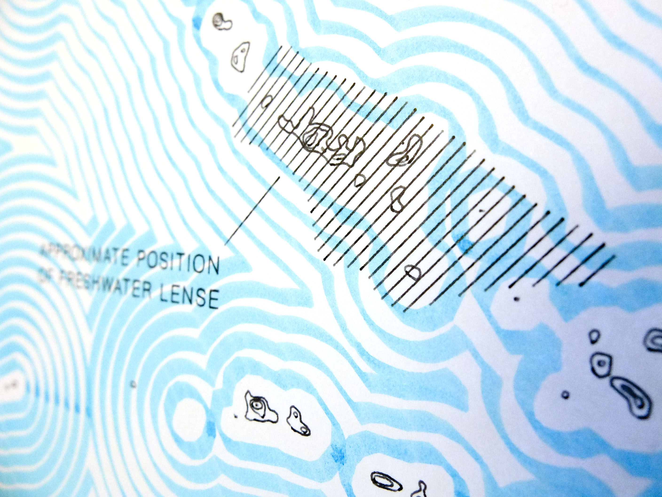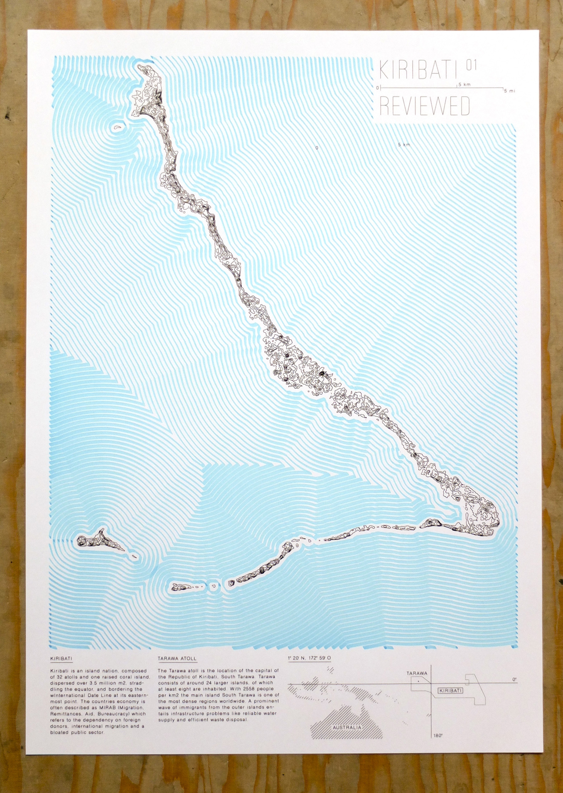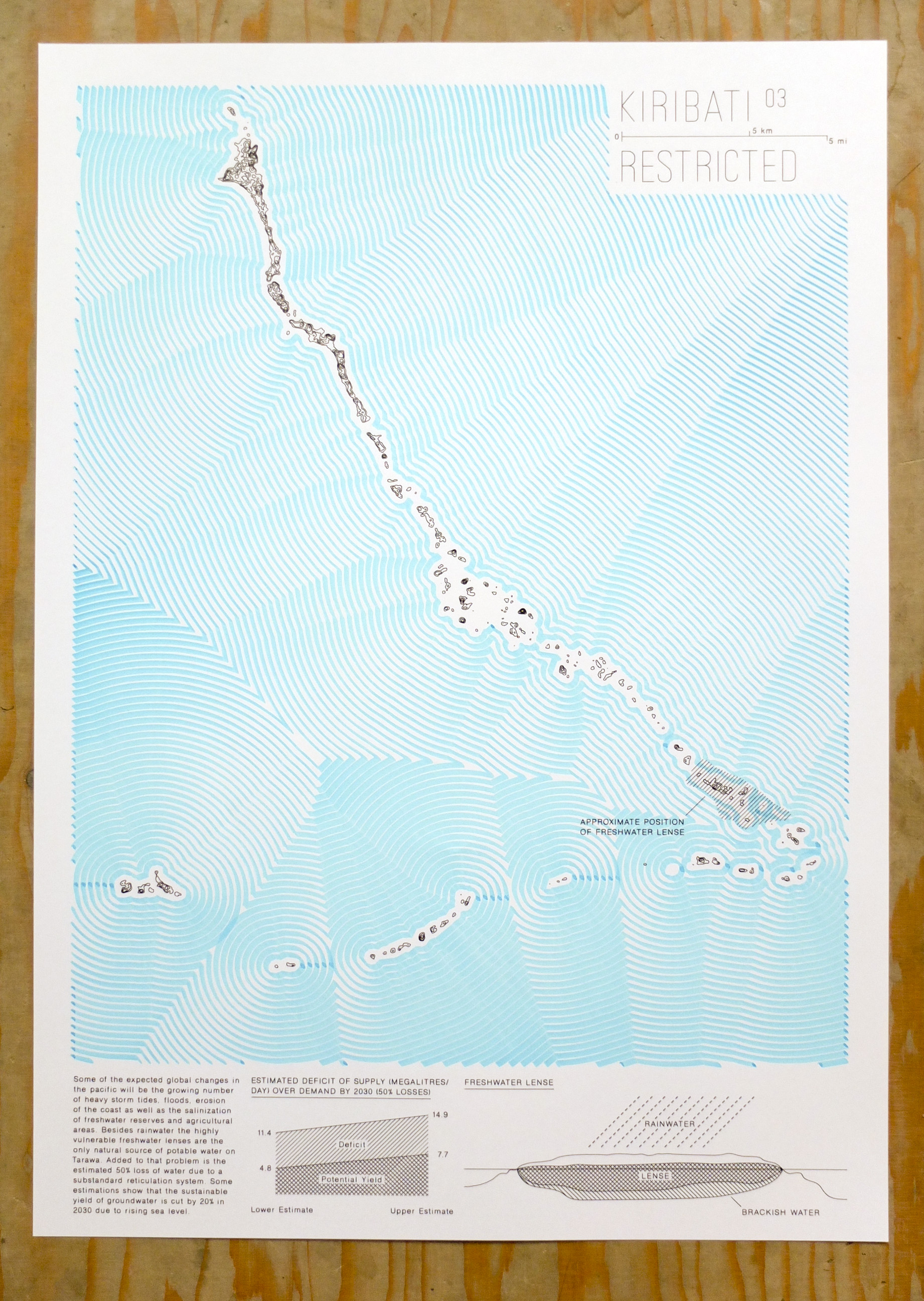 March 2013 – Series of four plotted posters about Tarawa which is part of the island nation Kiribati. With an maximum altitude of about 3 meters above sea level this could be the first nation which inhabitants have to be relocated in the next 50 years due to rising sea levels and pollution of drinking water. Our contribution to the competition 'Out of Balance – Critique of the Present' by Arch+. In collaboration with Silja Klepp (research) .