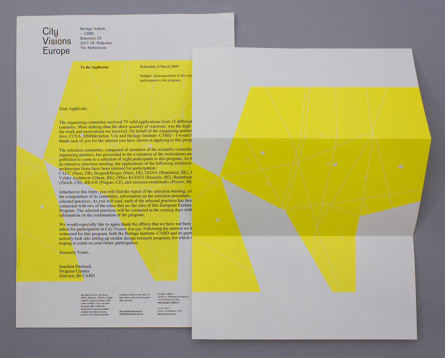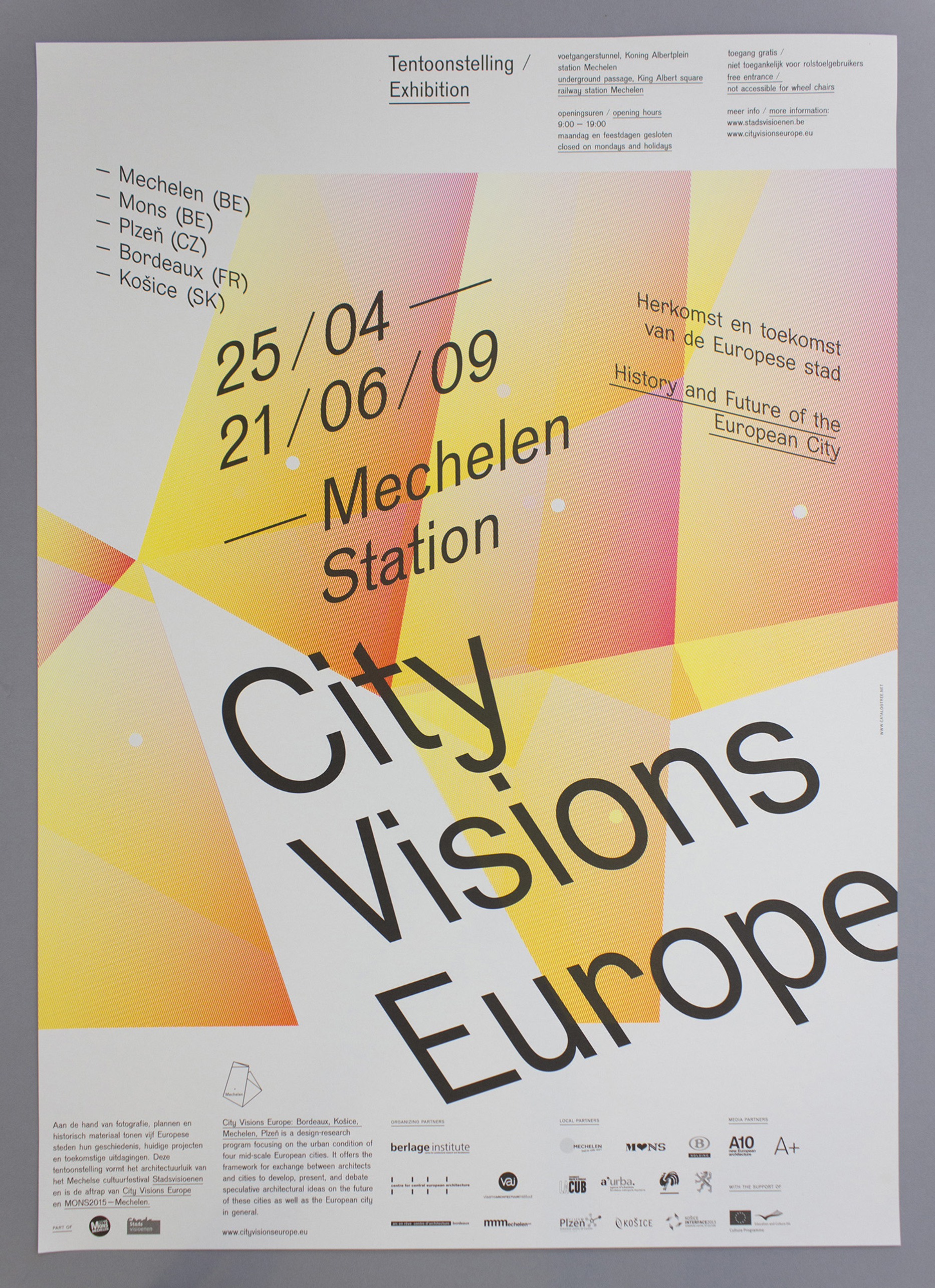 March 2009 – Identity for the two-year European exchange program 'City Visions Europe'. The design-research program focus on the urban condition of four mid-scale European cities: Bordeaux (FR), Kosice (SL), Mechelen (BE) and Pilsen (CZ).
