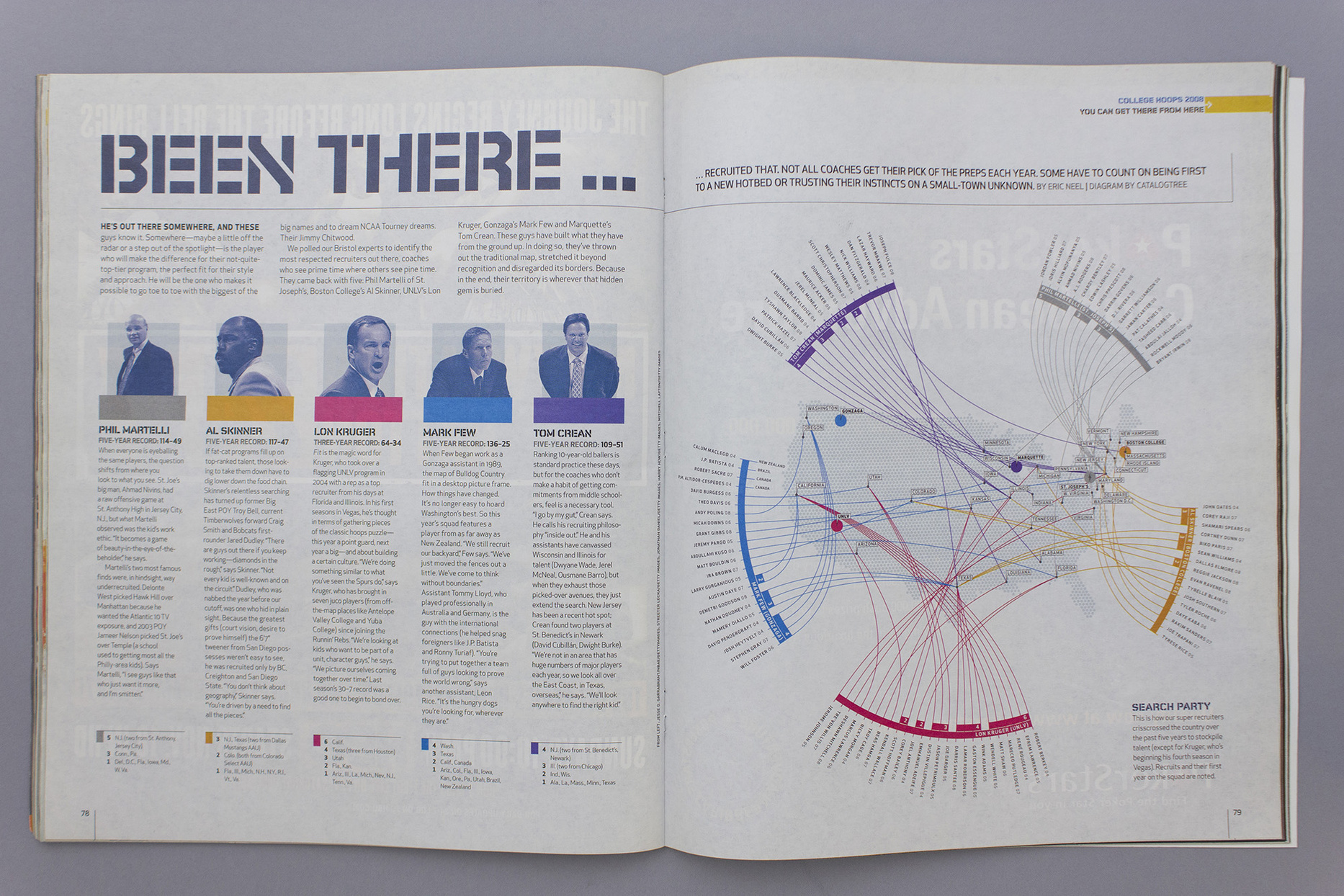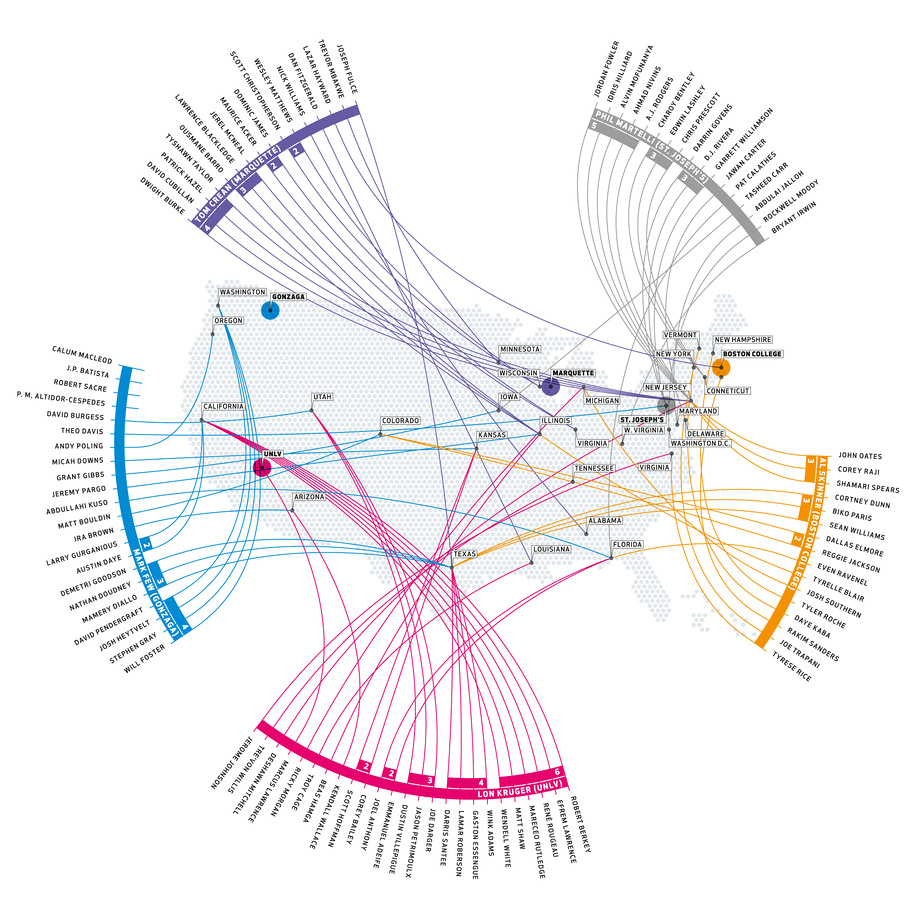 November 2007 – Infographic for ESPN the Magazine, Bristol (USA) showing origin of basketball talent. Recruits and their first year on the squad are noted.