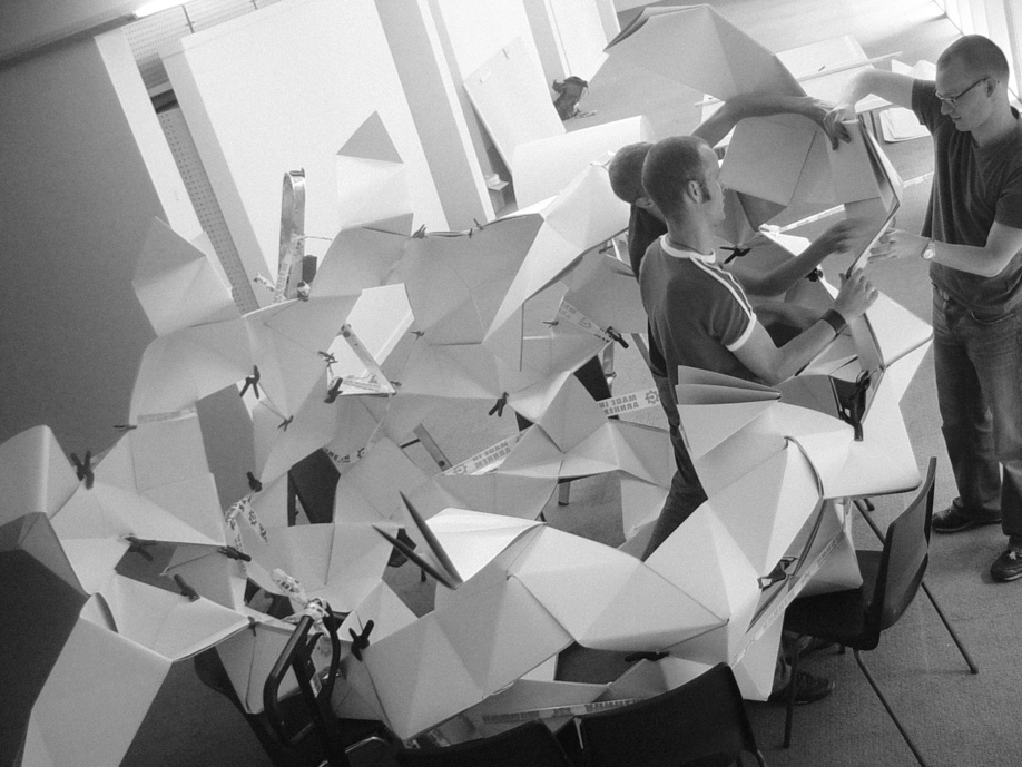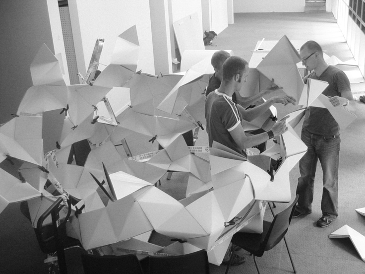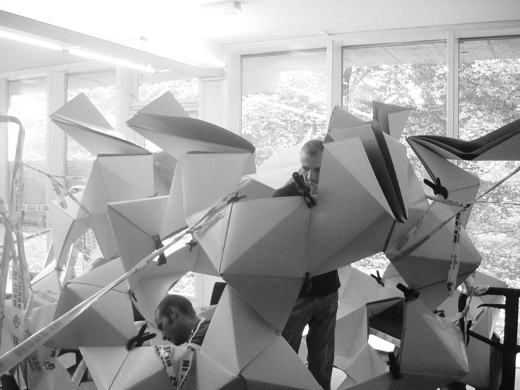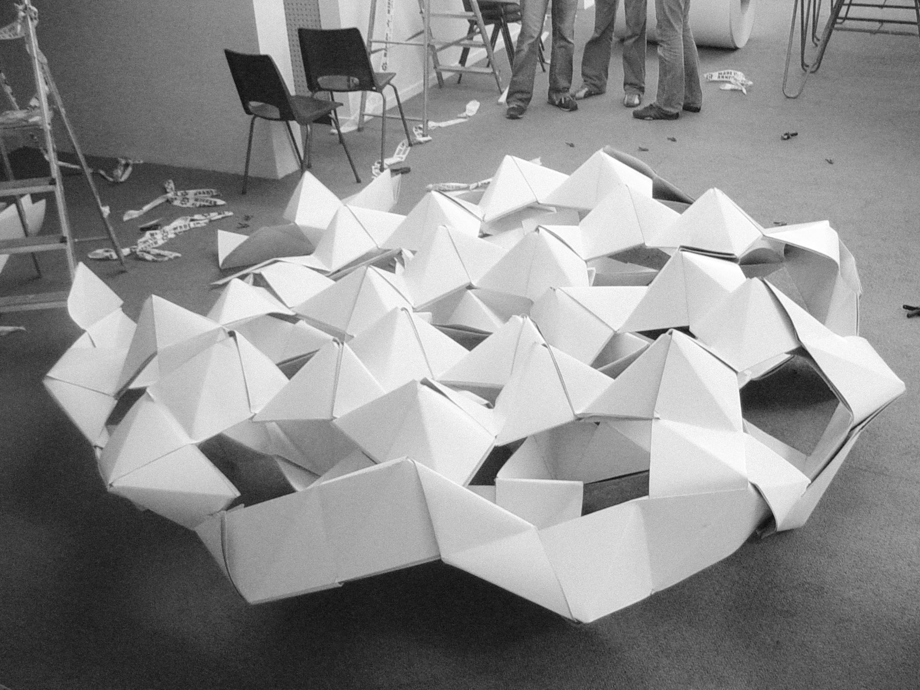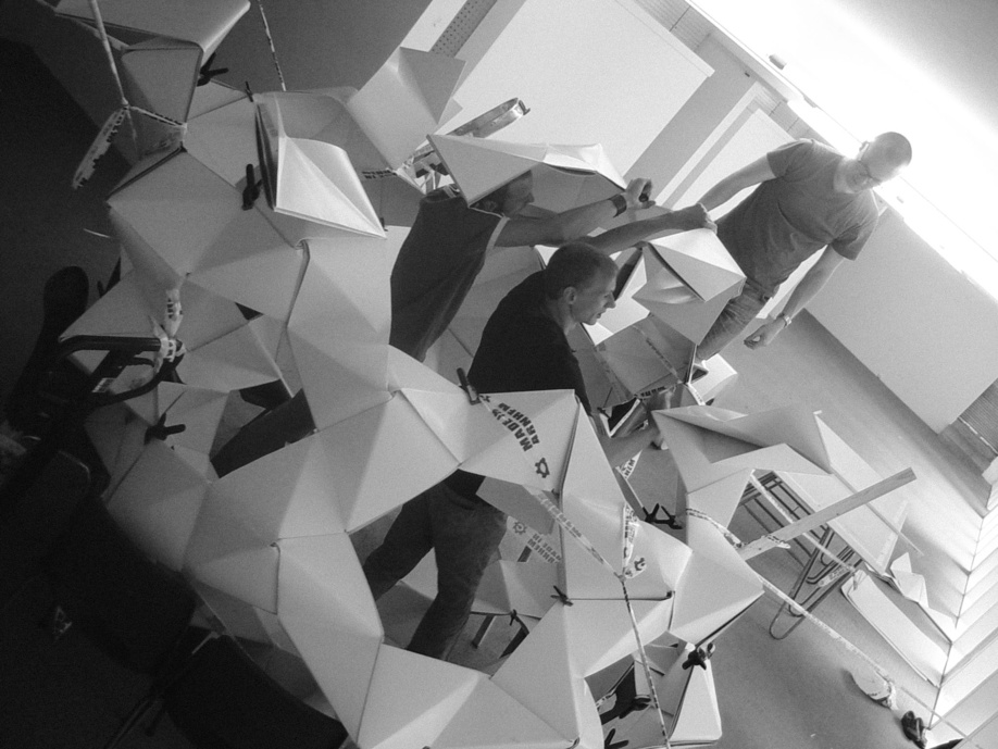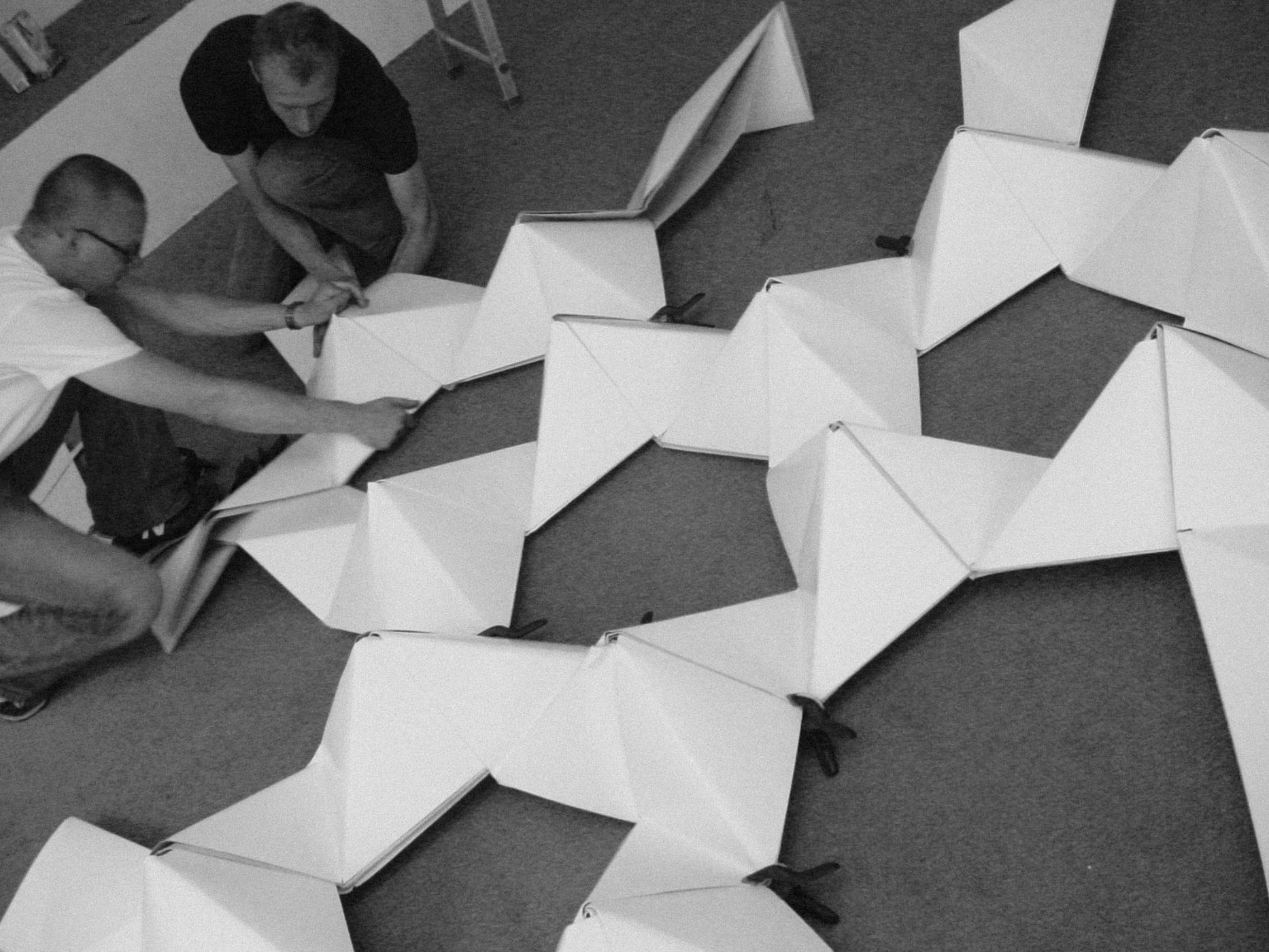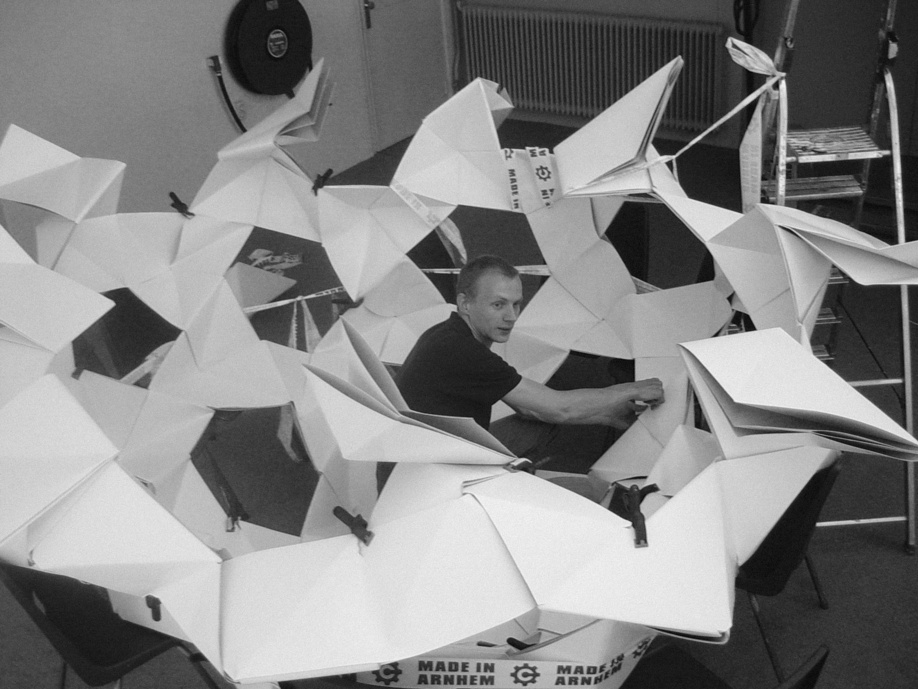 July 2005 – Project for Made in Arnhem. Attempt to build a structure as large as possible using only paper. The folding system shown on the photograph is developed by Thomas Hull. In collaboration with Hoogte Twee Architecten (workshop coordinator) .