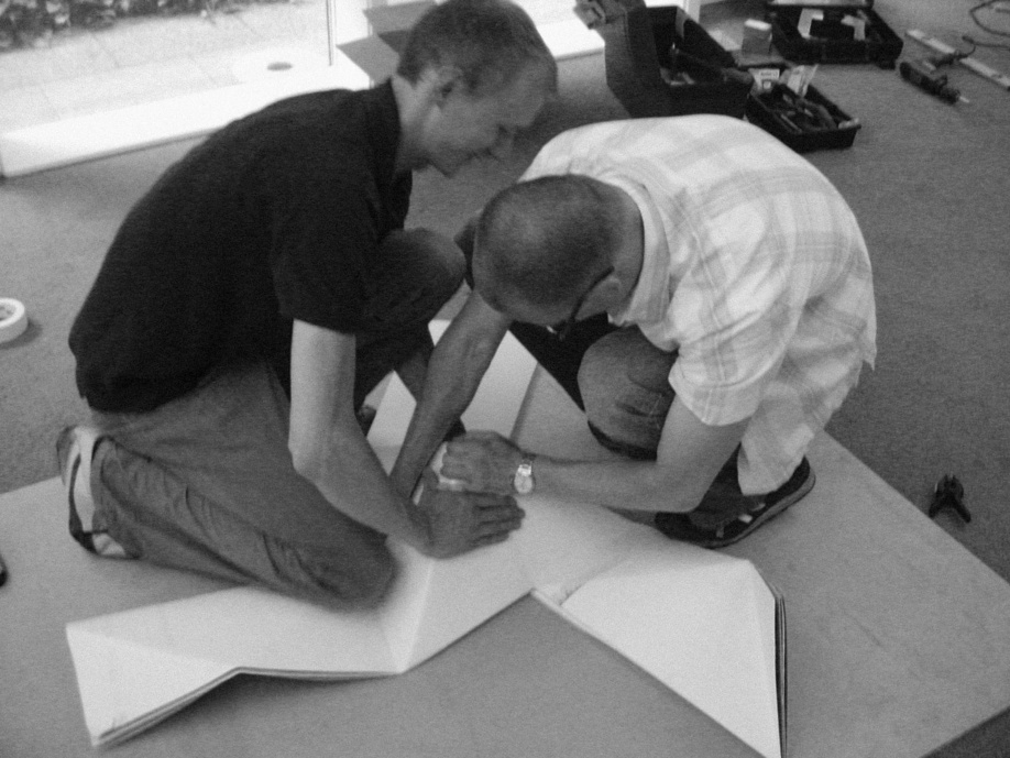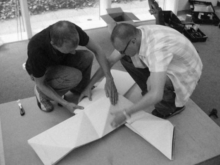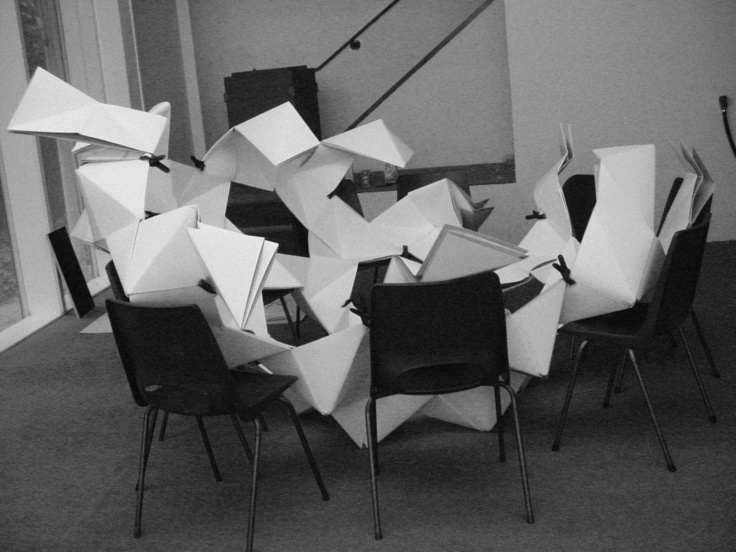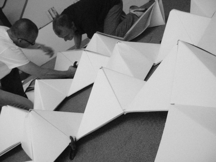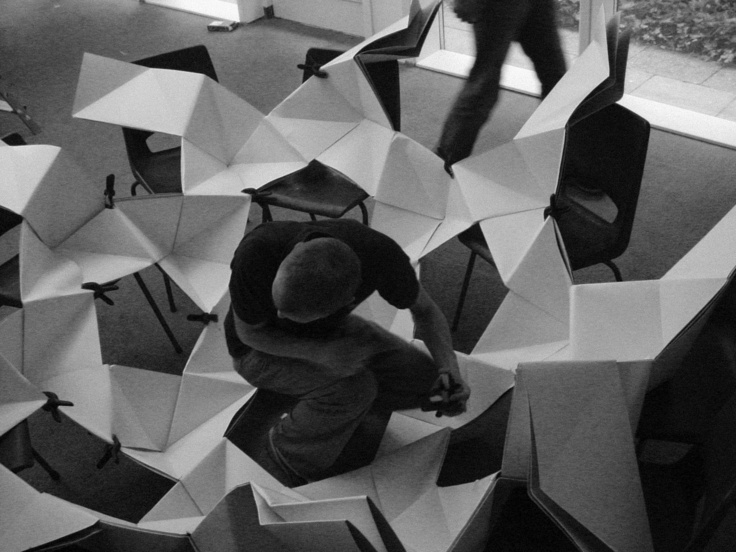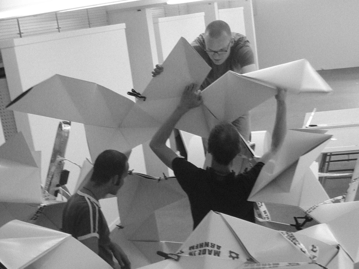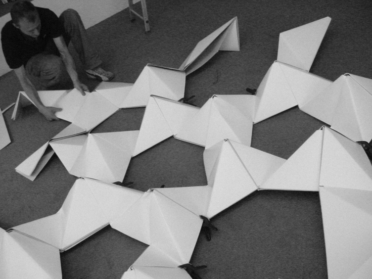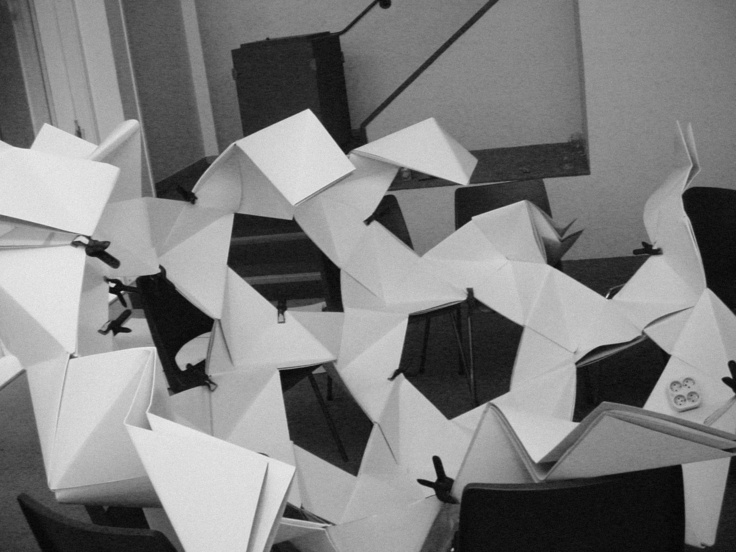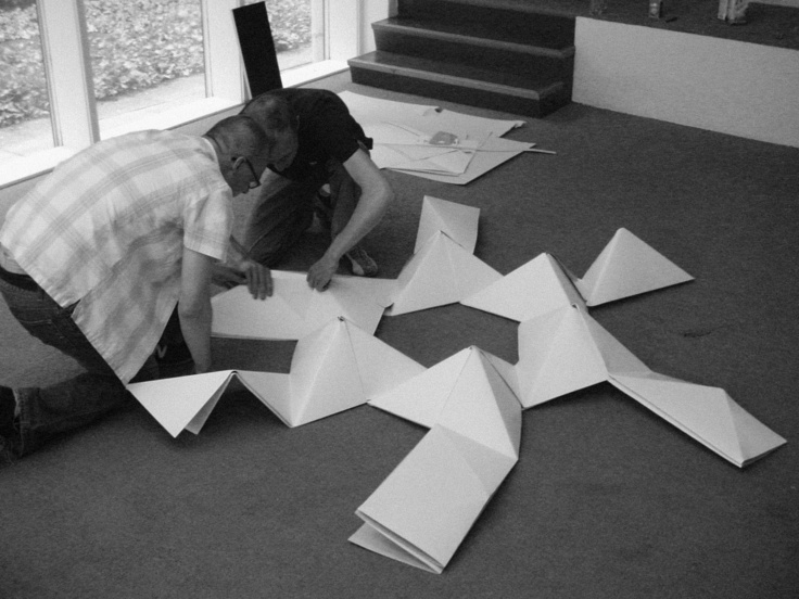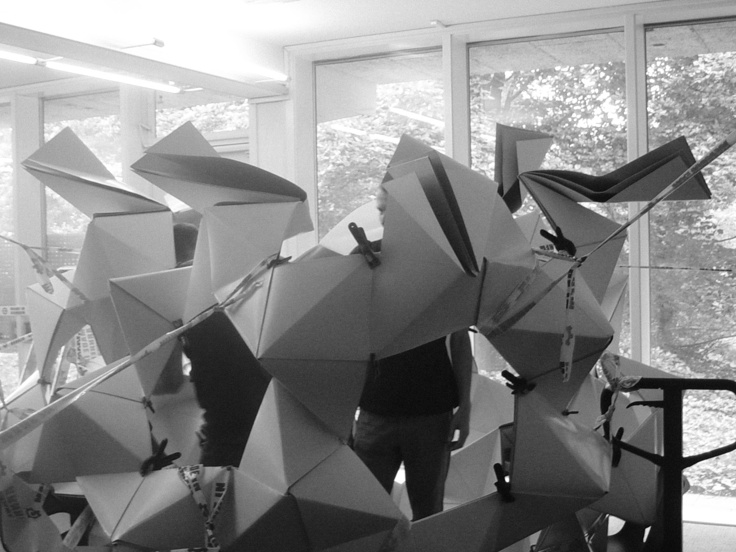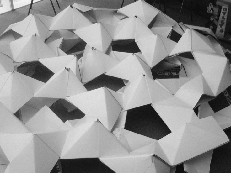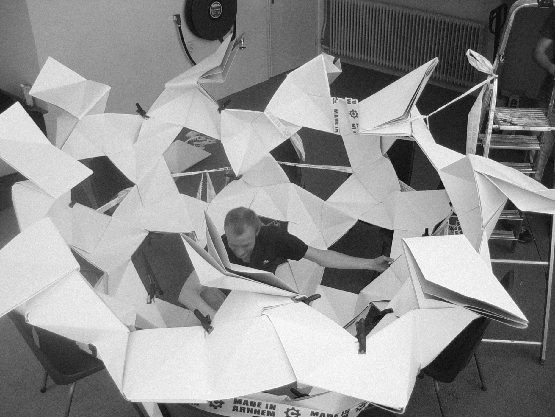 July 2005 – Project for Made in Arnhem. Attempt to build a structure as large as possible using only paper. The folding system shown on the photograph is developed by Thomas Hull. In collaboration with Hoogte Twee Architecten (workshop coordinator) .